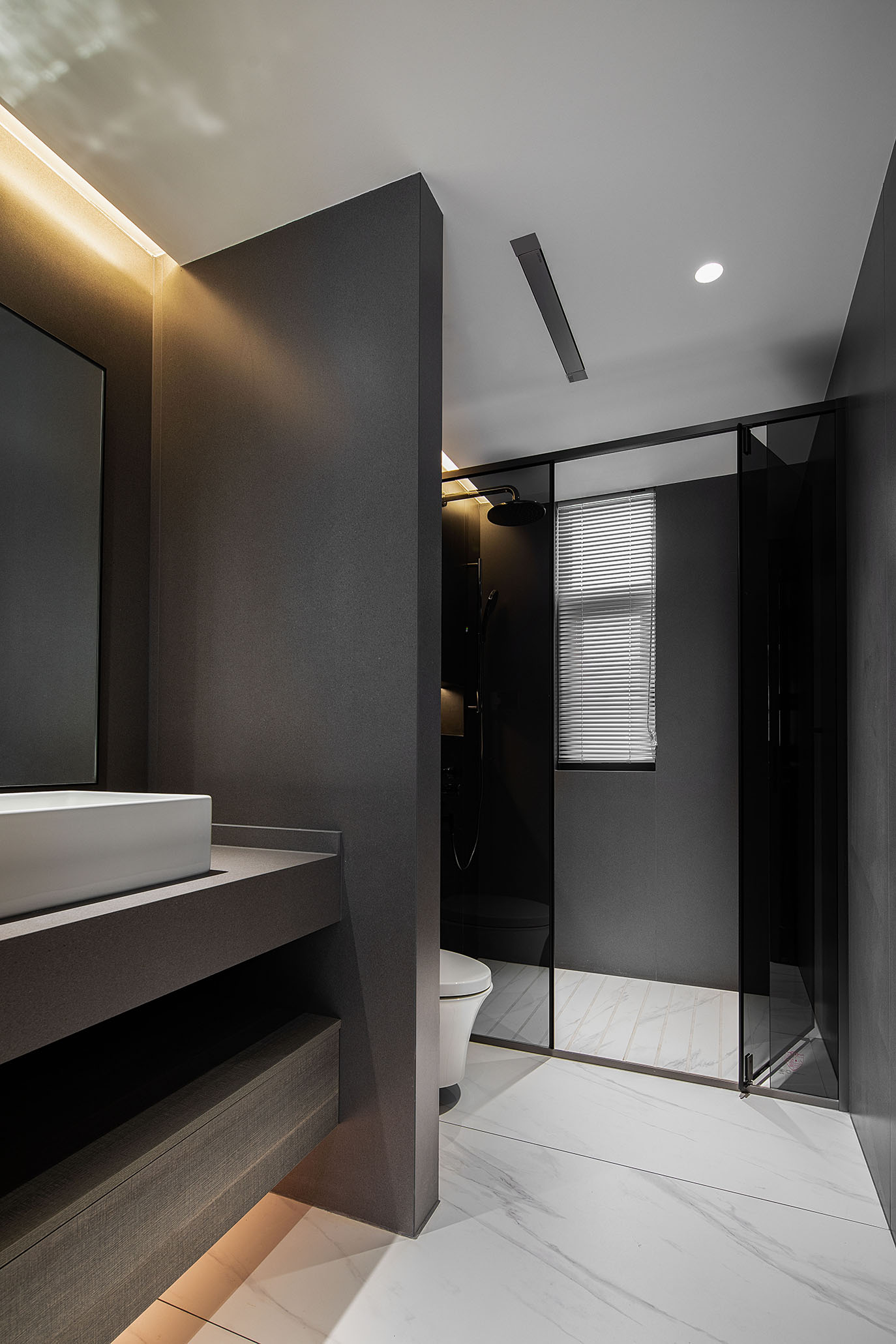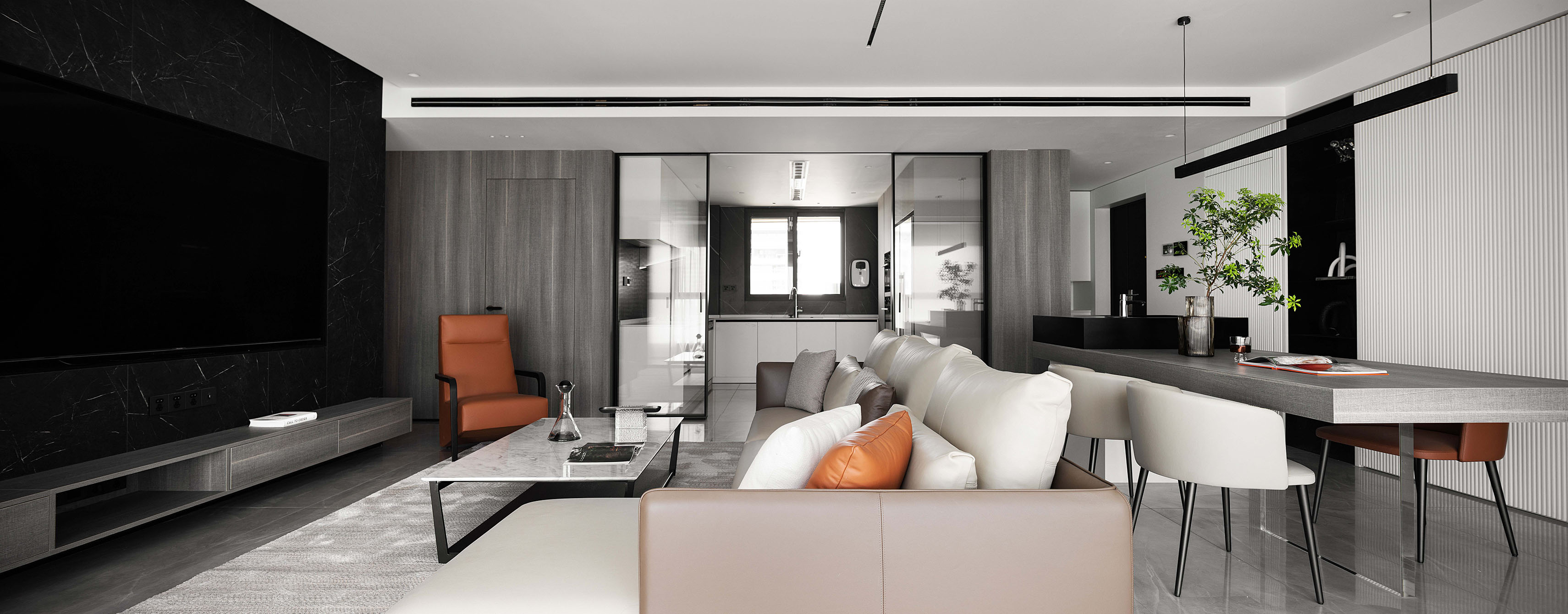 逼真的高級灰大理石紋理、柔和的駝灰色沙發(fā)、隔而未隔的鋁框玻璃移門,