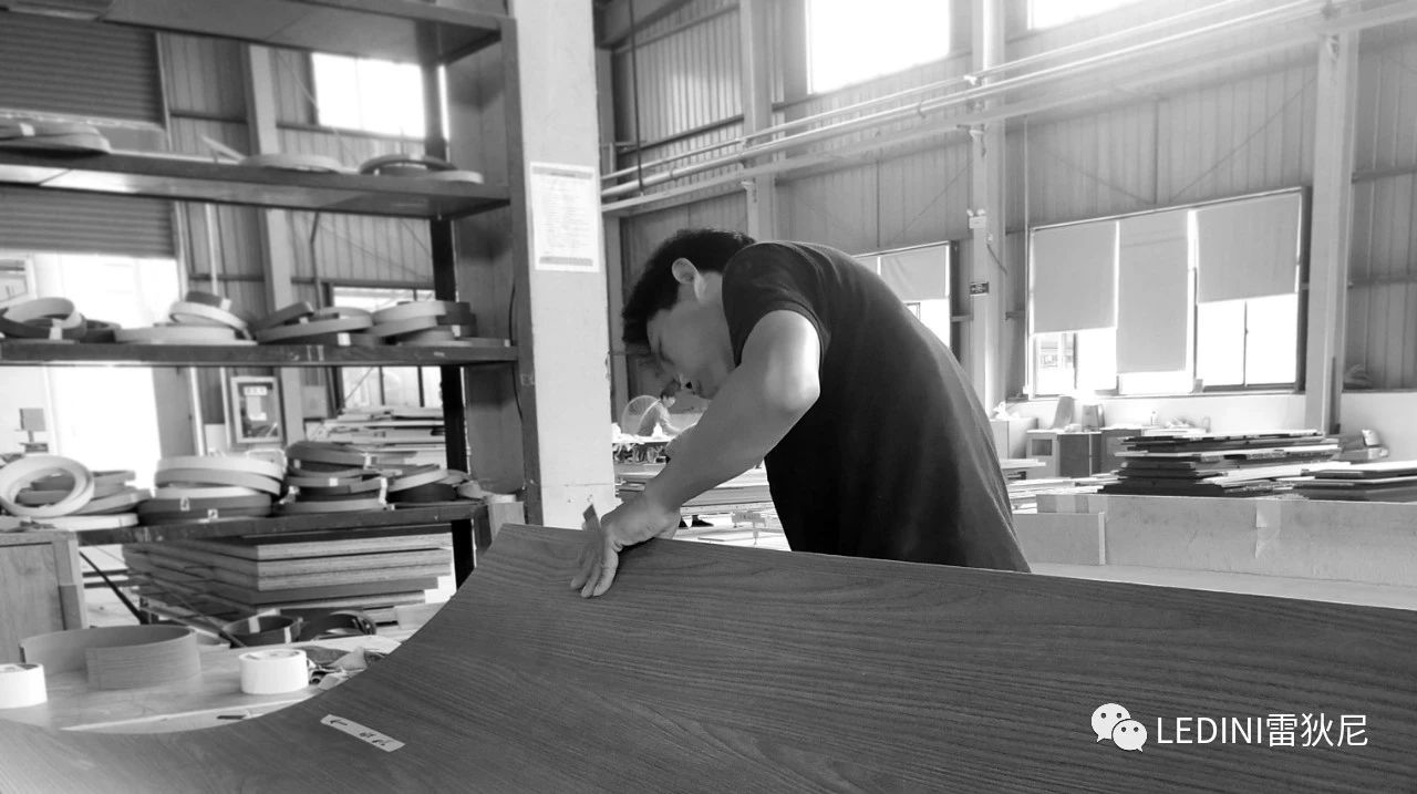 采購進口木皮,精挑細選后送去專業染色加工,運回工廠,采用意大利環保基材板、進口膠壓貼,