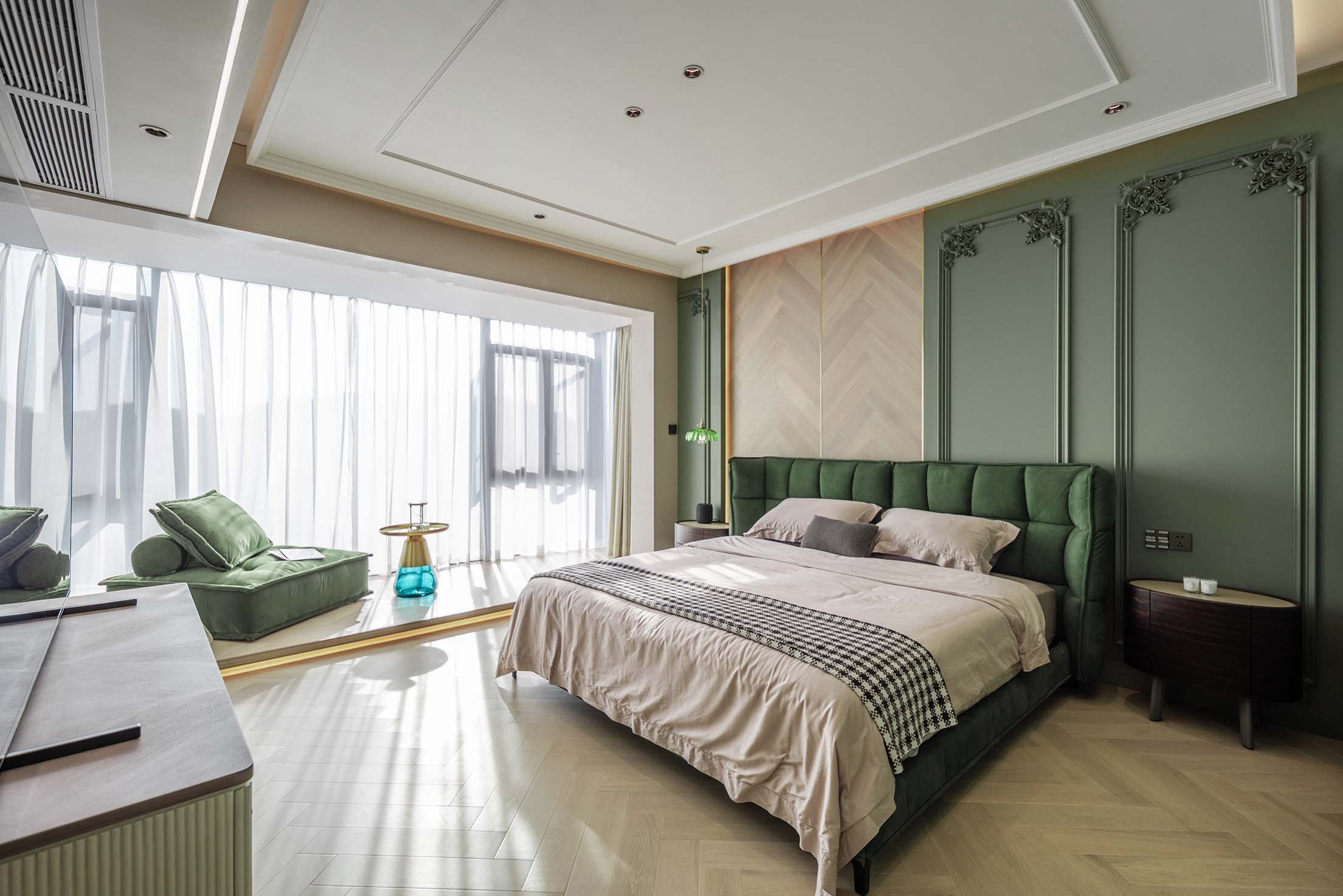 主臥以綠色和灰色調為主,很愜意,很治愈。