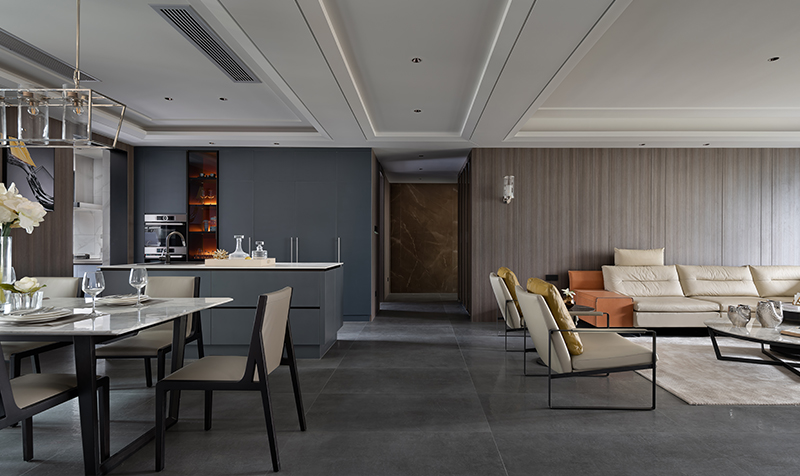 還原大自然色系的色彩會給人帶來愉悅的感官體驗,經(jīng)典的大地色系也能輕松的打造出居住環(huán)境的高級感。深灰色櫥柜板與玄關(guān)同色系的木紋色護墻把開放空間完美的分為西廚與客廳兩個部分,看似同處于一個空間卻各司其職,又不會分割的太過生硬。