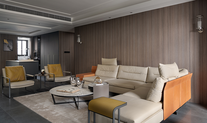 淺色護墻板搭配乳白色沙發(fā),起到空間置后的作用,大理石紋的茶幾與淺色地毯互相呼應(yīng),加入黃色與橙色的點綴,與護墻板的原木色對應(yīng),護墻板的木紋顯得客廳十分的簡約大氣,使得大面積的純色不再單調(diào)。