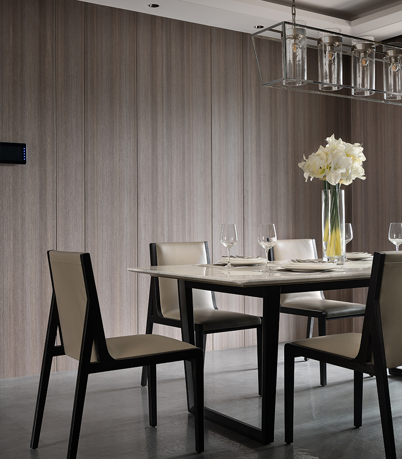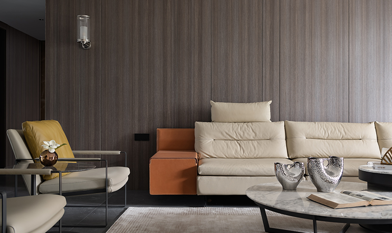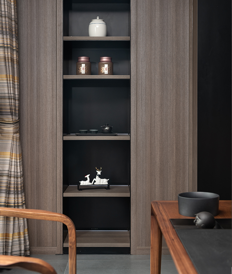 茶桌處搭配深木紋柜更具中國古典風(fēng)美學(xué)。