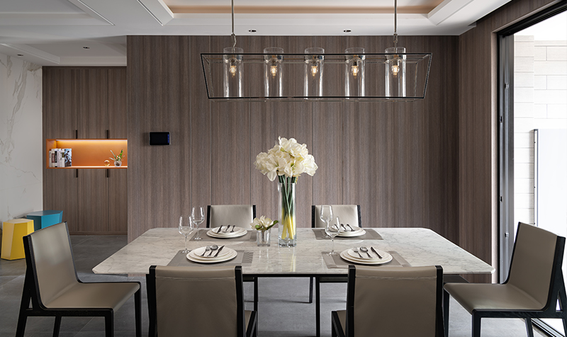 餐廳整體色調(diào)更加統(tǒng)一一些,柔和的護墻板木紋顯得餐廳更加的溫馨,更加富有變化,陽光從窗口照射進來,配合金屬與玻璃材質(zhì)的燈,更加凸顯沉穩(wěn)的氣質(zhì)。