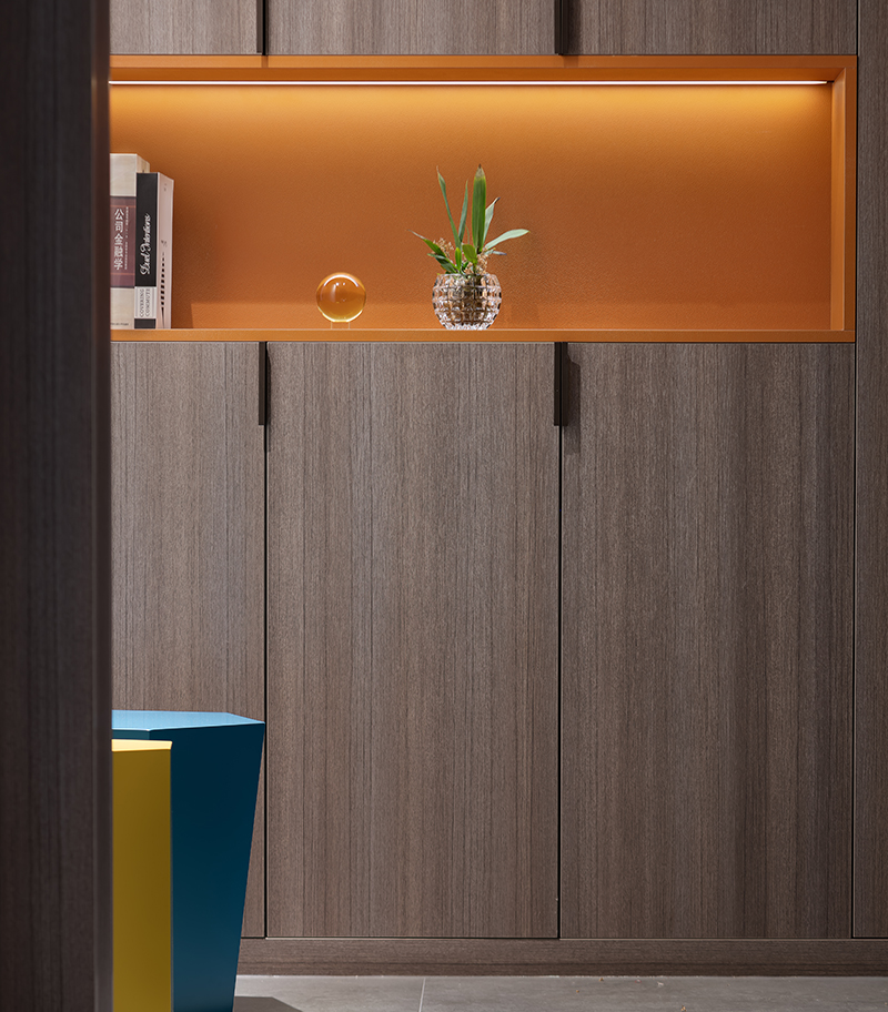 西廚櫥柜選用深灰色板,與其他空間分為冷暖色調(diào),展示柜處配合橙色板與玻璃門板搭配,與客廳色調(diào)聯(lián)系在一起,具有輕奢質(zhì)感和時尚氣息,高低飽和度的色彩極與極的碰撞,極冷與極暖的對比,更加的體現(xiàn)出色彩的高級感。