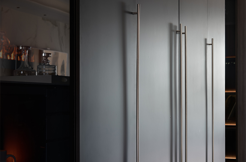 酒柜隱蔽燈光使得酒柜更加具有高級感,深色柜體與玻璃門板的搭配減少了深色的壓迫感,增加了走廊的通透性。