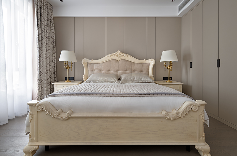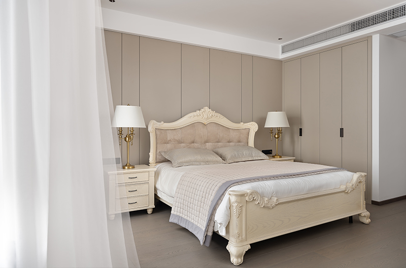 主臥采用了淺米色系的護墻板與衣柜連接在一起,低純度的色彩使人放松眼球。歐式家具與作為背景色的護墻板色系一致,增添空間豐富性。整個臥室更加的靜謐。