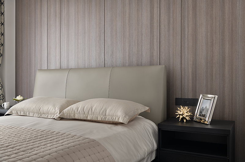 次臥則采用現(xiàn)代風(fēng)格家具與淺色木紋護墻搭配,深色床頭柜起到點綴作用。