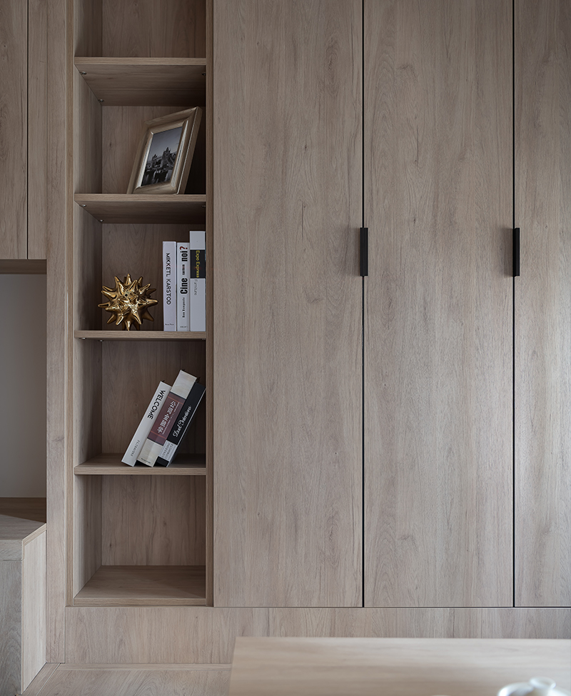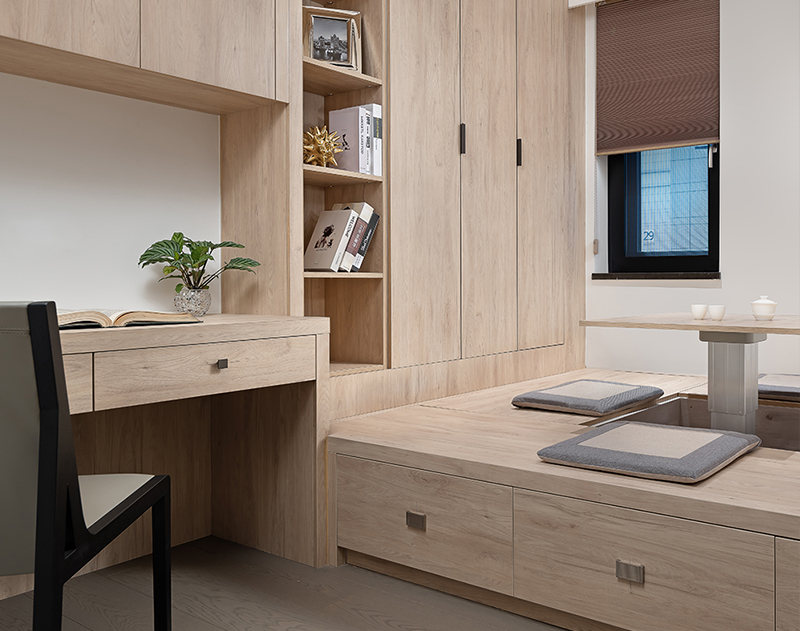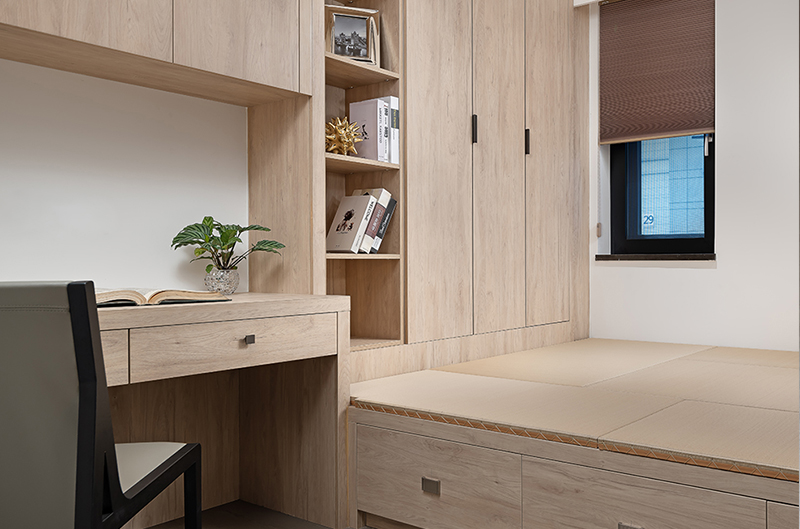 書房淺色木紋的榻榻米與書柜書桌一體,空間更具有統(tǒng)一性。淺色的柜體最大限度利用的采光,讓空間更明亮。榻榻米的設(shè)置讓房屋的置物率大大提升。