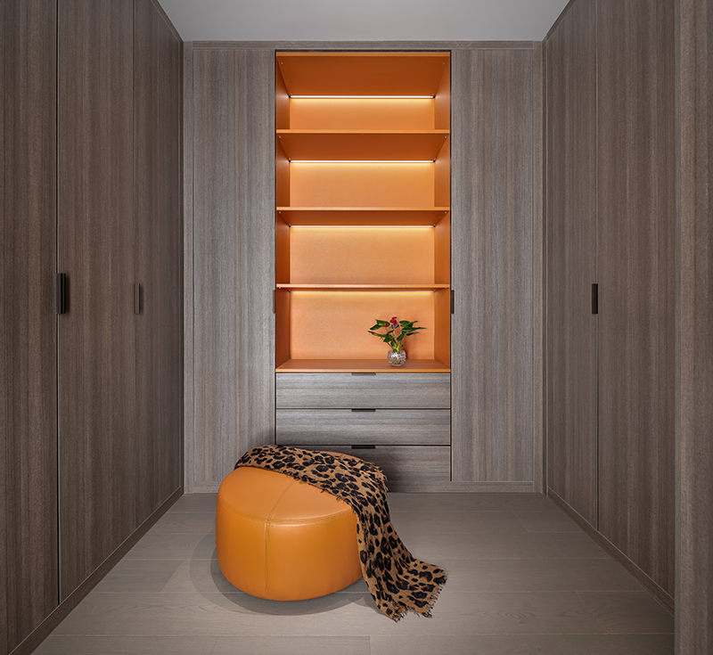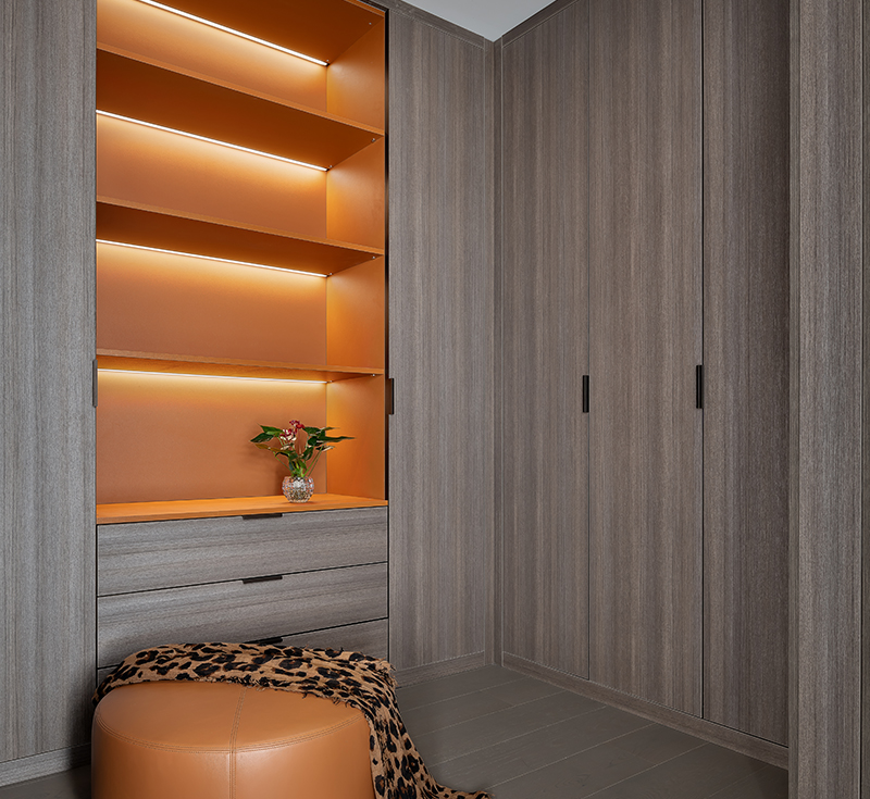 衣帽間的開門柜與開放柜結(jié)合,選用橙色的層板與全屋色調(diào)統(tǒng)一,并在隱蔽式燈光的照明下更加的時尚,搭配橙色皮質(zhì)更衣凳起到點綴性作用。