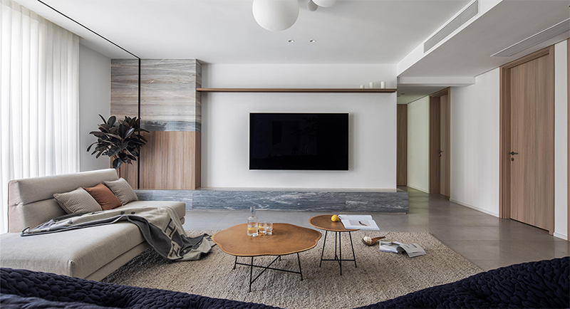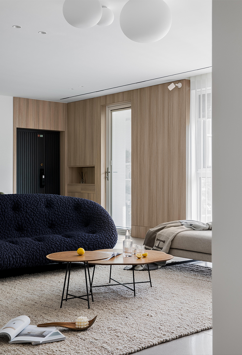 木紋護墻、米白色沙發(fā)平和舒緩,將自然氣息引入家中;