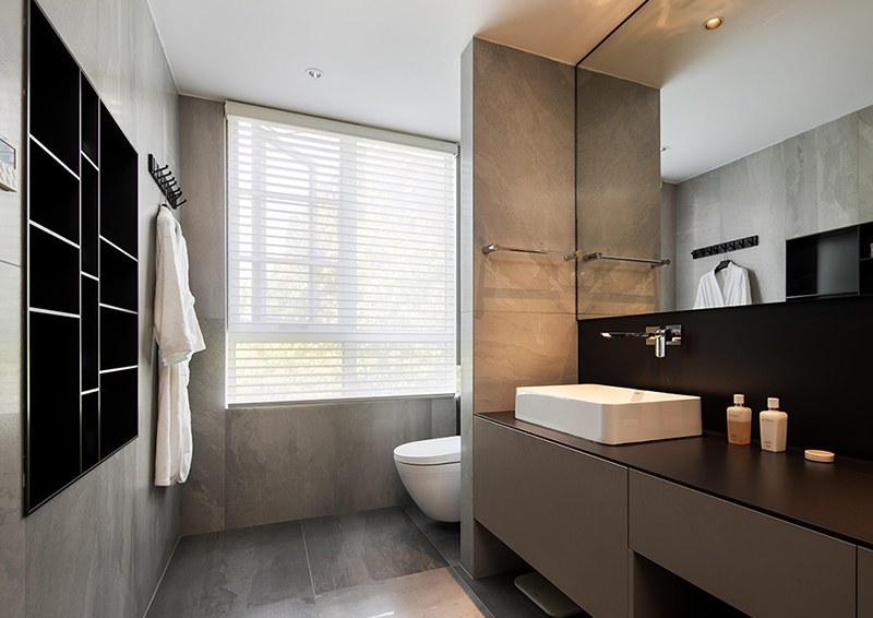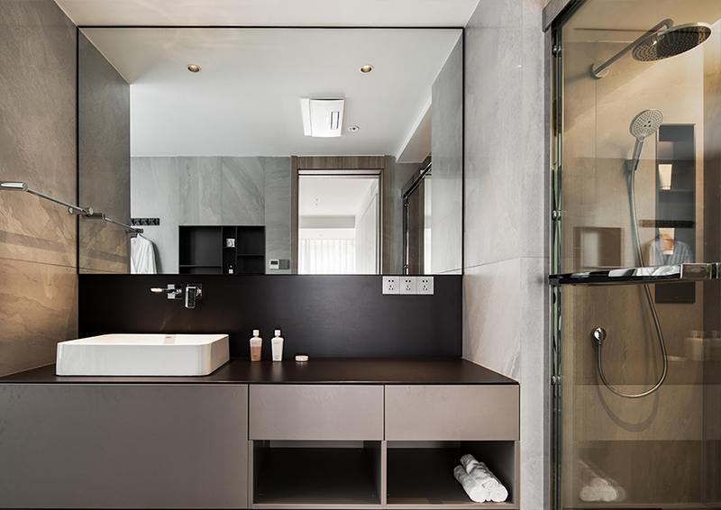墻壁嵌入深色壁龕與衛(wèi)浴柜呼應,